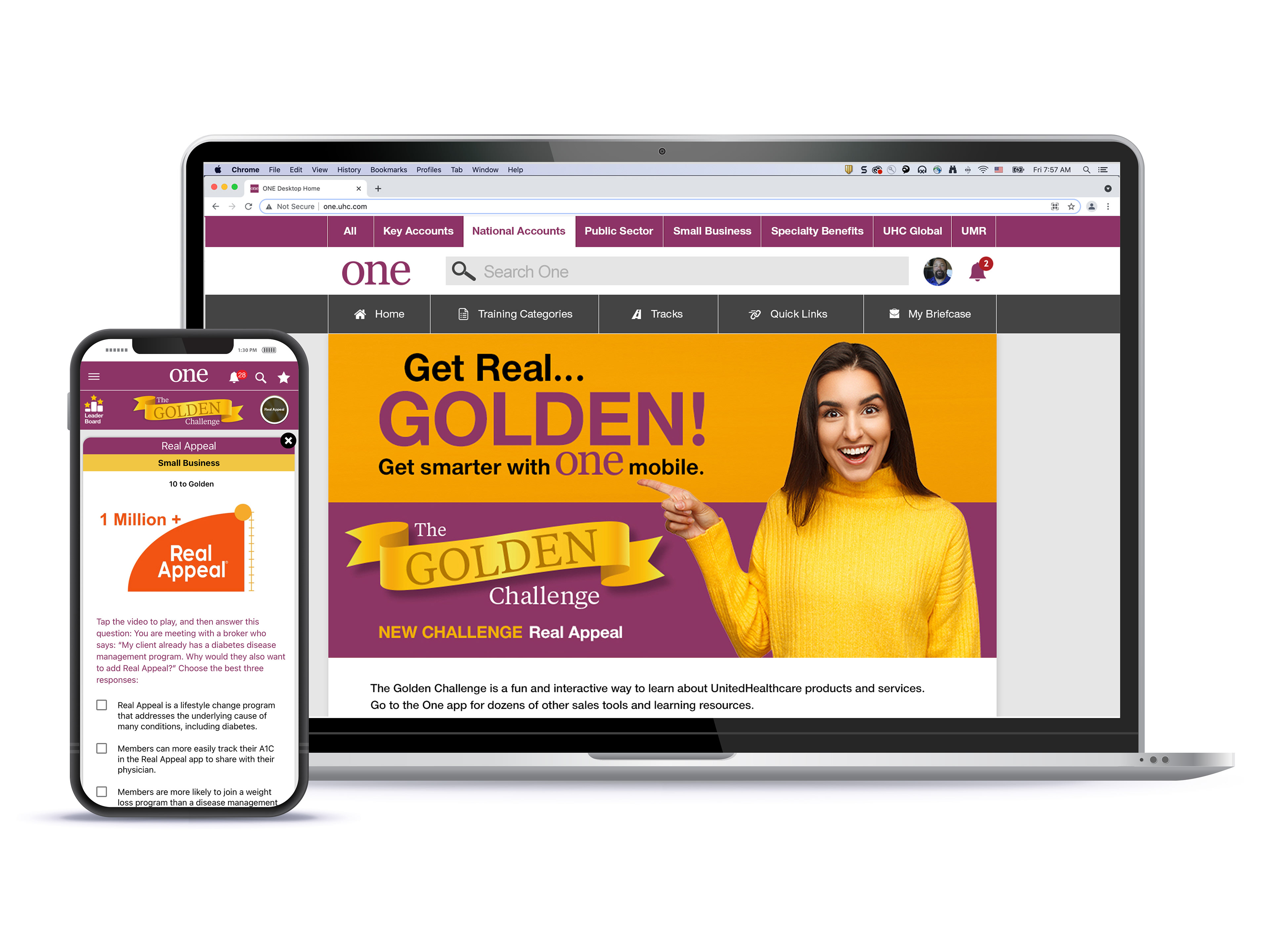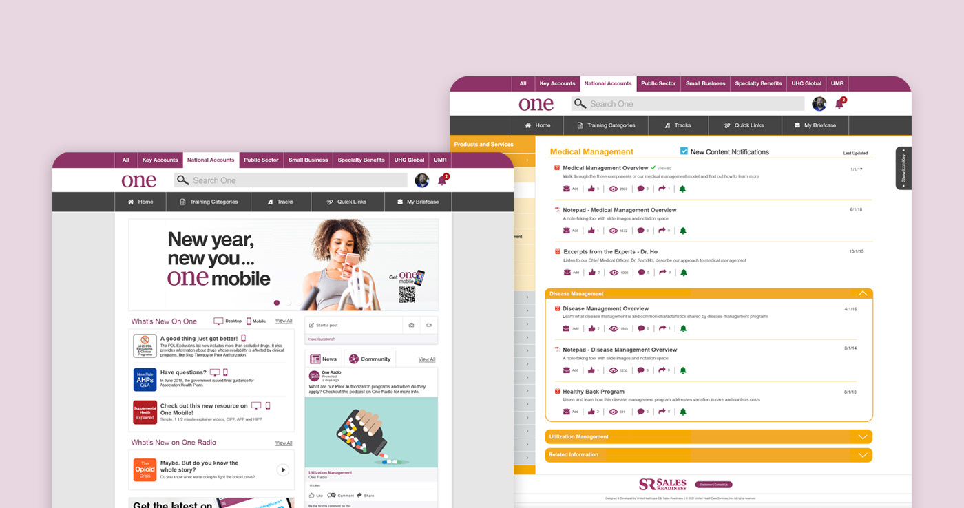 One is a hub for sales training resources and performance support created by the UnitedHealthcare Sales Readiness Organization. One and One Mobile offers the sales learner support and in the time of need, content to help them promote UnitedHealthcare products and services. The overall goal is to help the sales learner be more successful and to increase sales and referrals.
